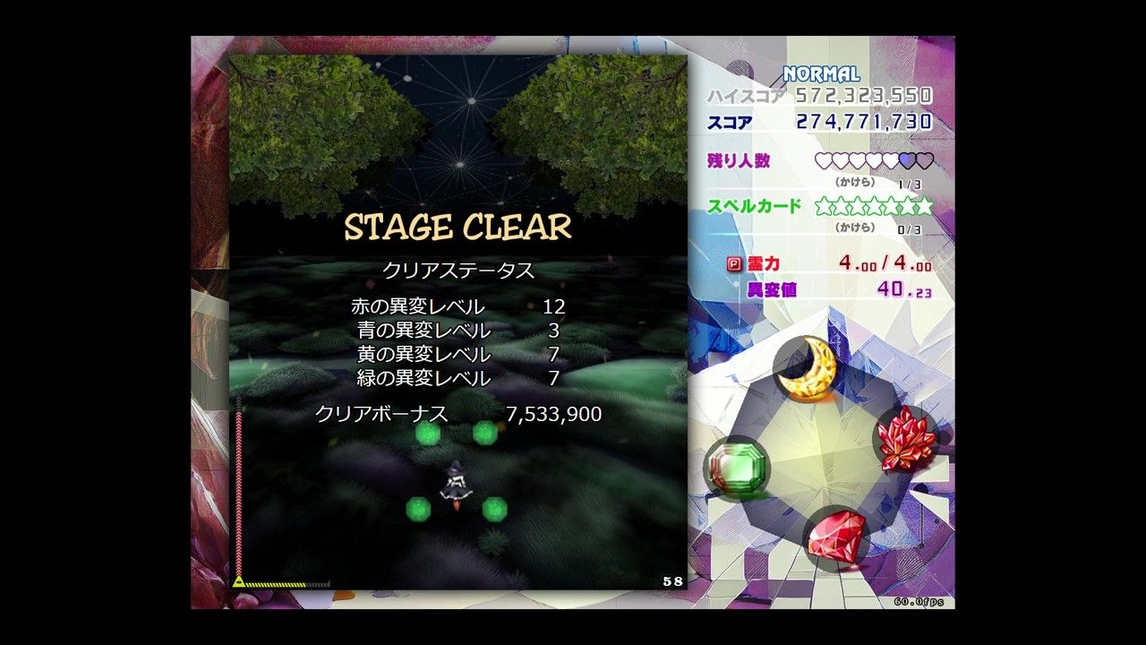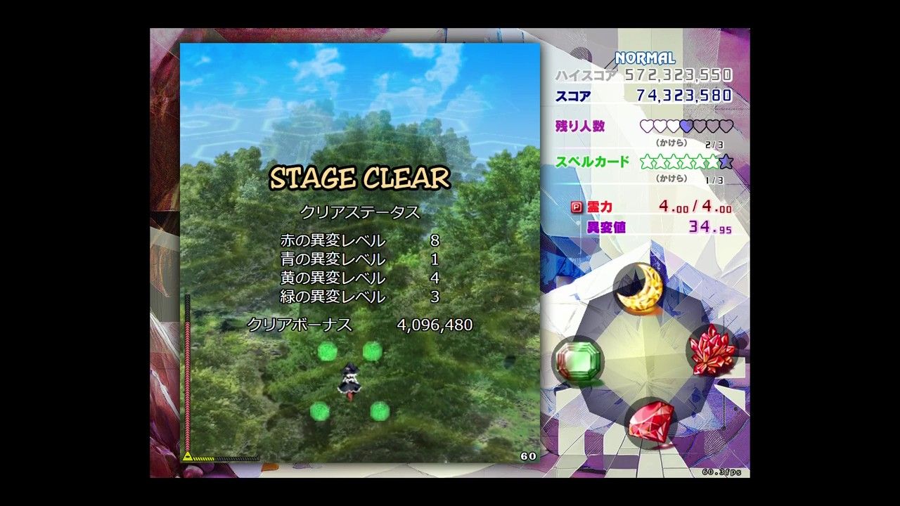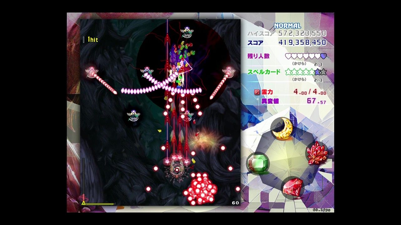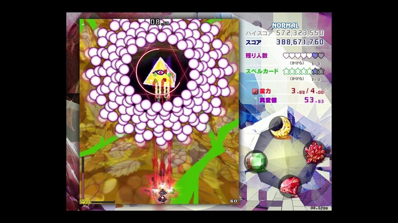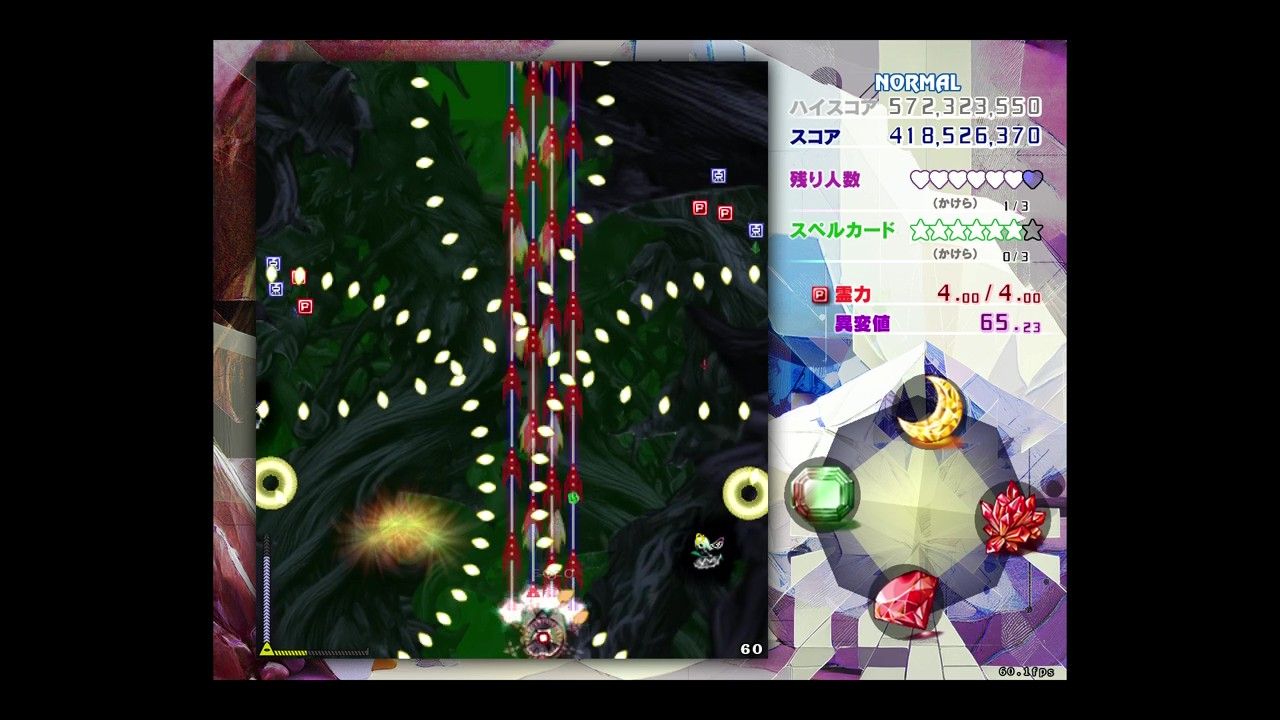 今作で重要になるのが異変敵です。倒すと盤面の弾を消してくれる上、ボム/残機のかけらを落としてくれます。異変敵は異変敵ゲージをMAXにすると出現します。ゲージのたまる条件は「「異変石のかけらを取得」「道中の敵を倒す(ヒット数が多いと効率UP)」「時間経過(ボス戦限定)」」(東方Project攻略Wiki)です。この異変敵をいかに多く倒すかでリソースの量が変わってきます。