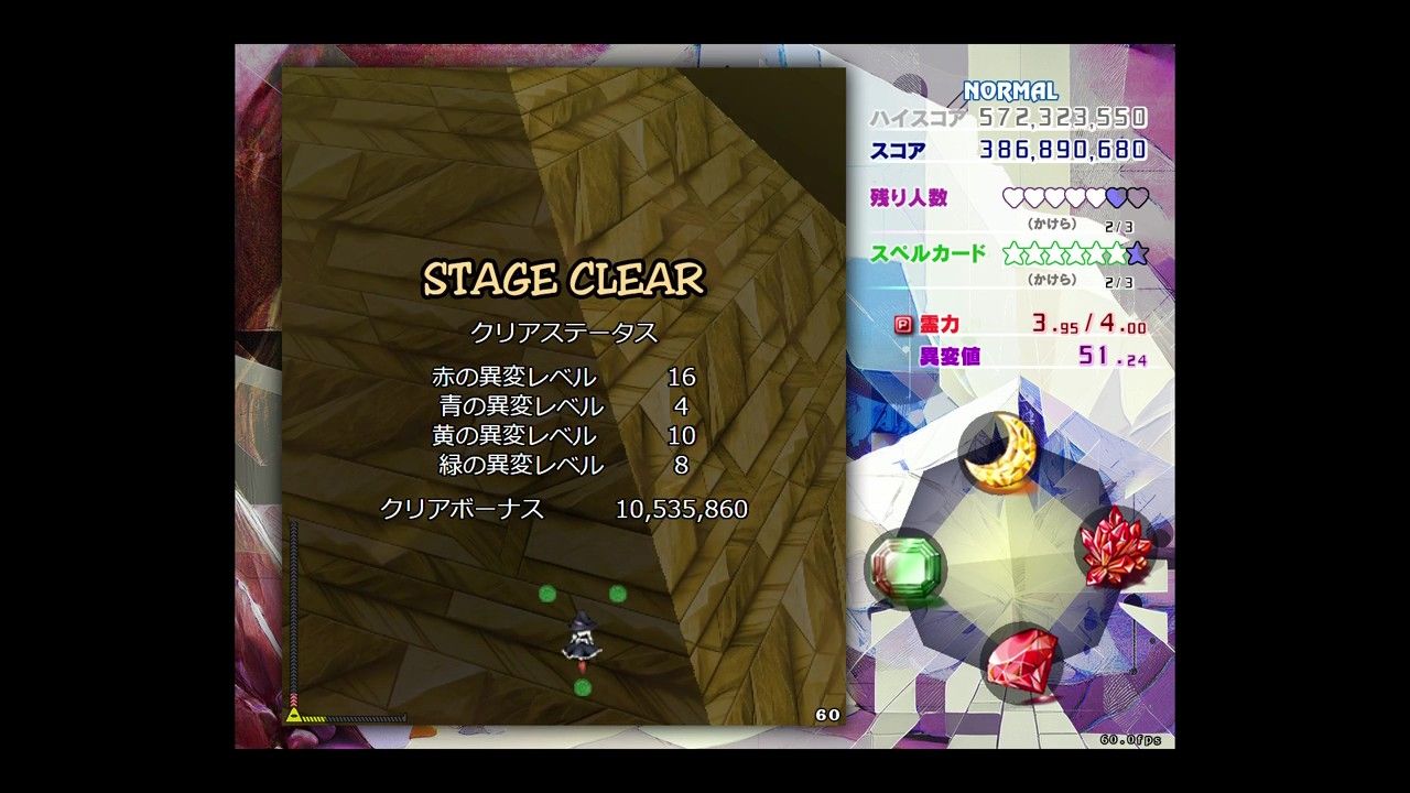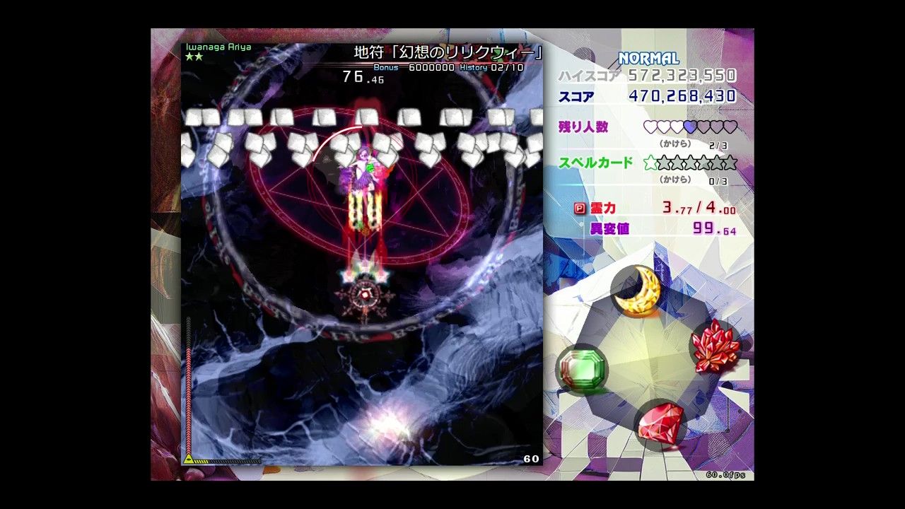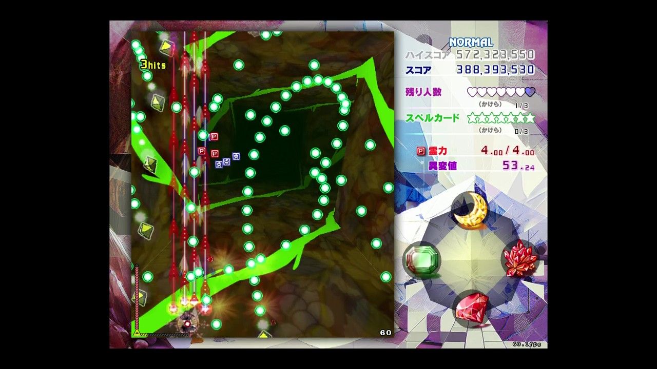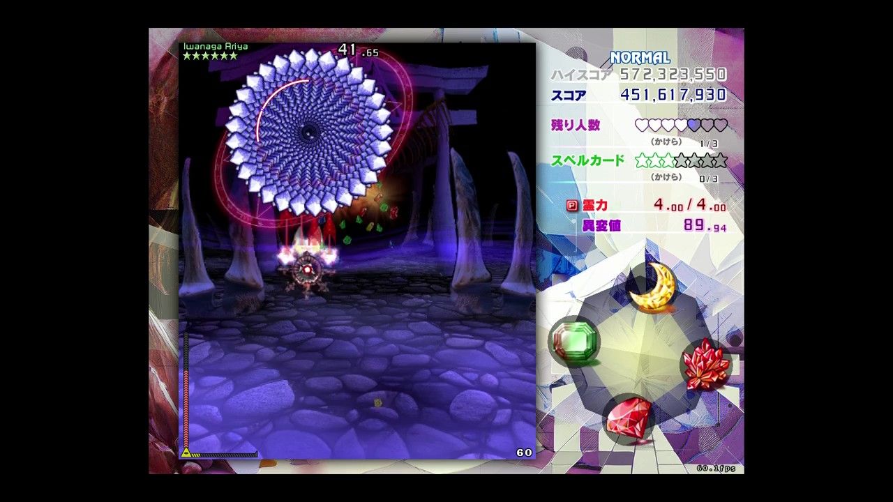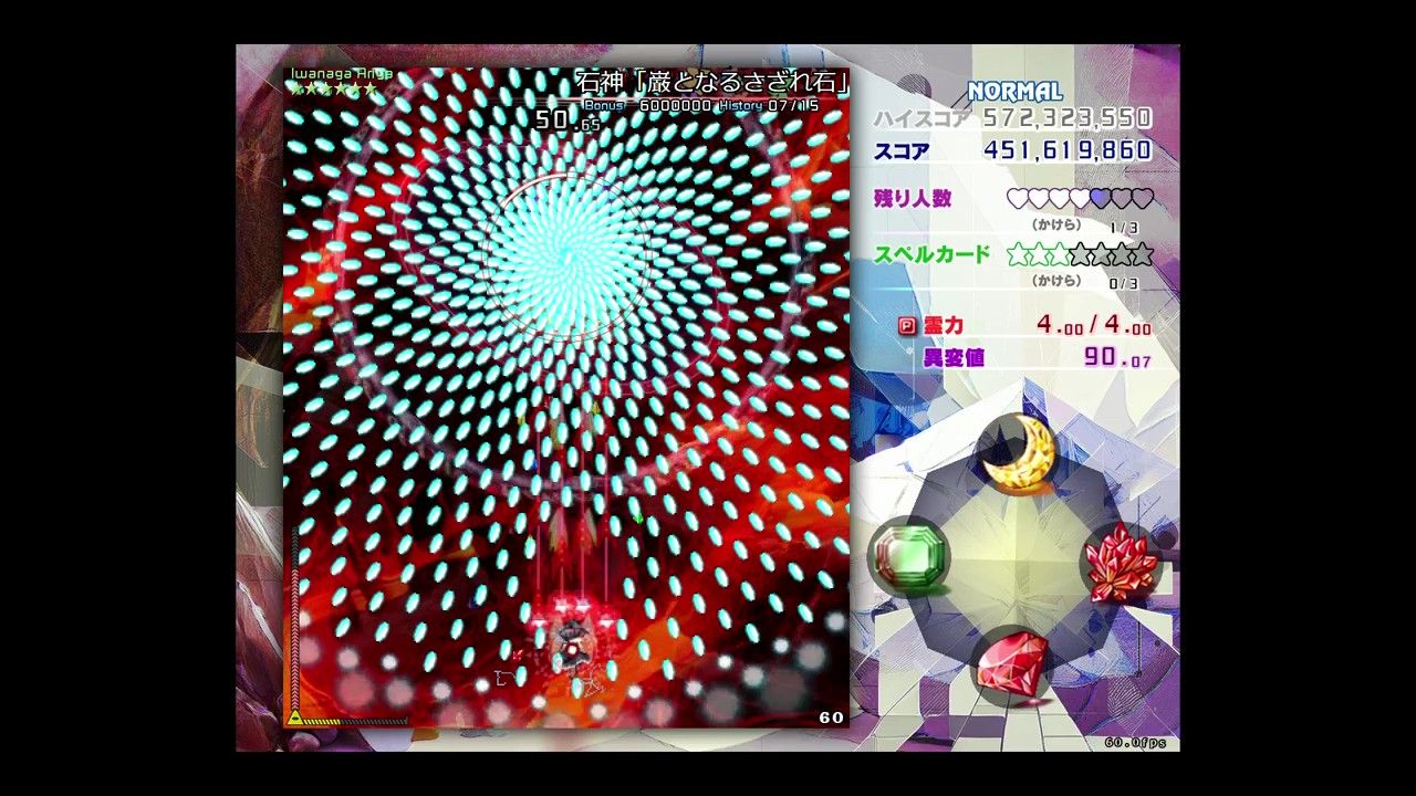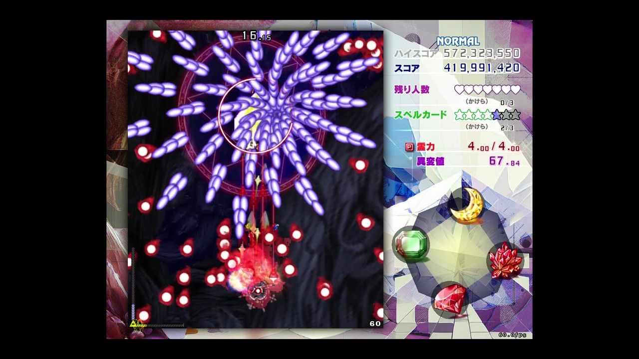 人によって得意・苦手が分かれると思います。弾が配置されたらグレイズを稼いで異変石の欠片を稼ぎ、避けられる人は避けて、無理な人はボムを撃ちましょう。