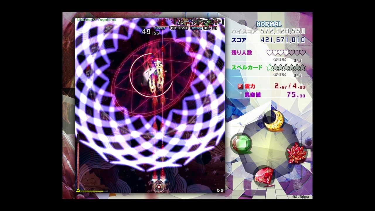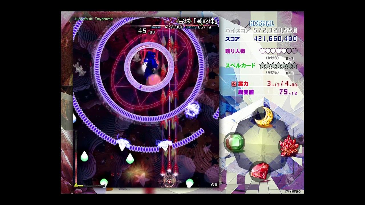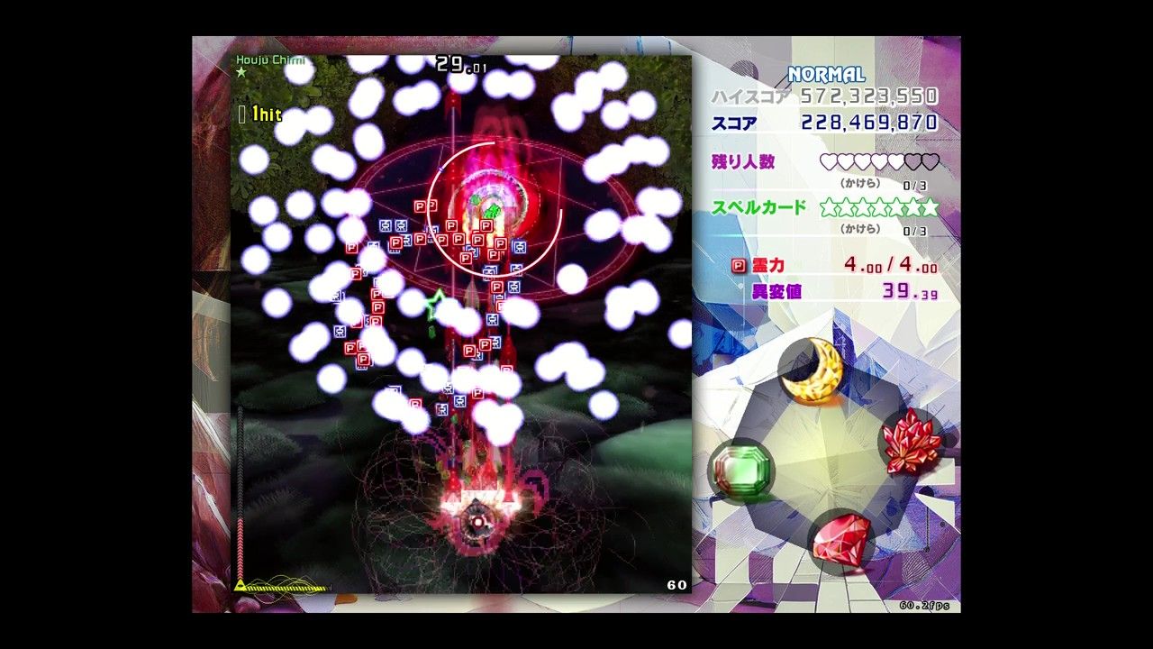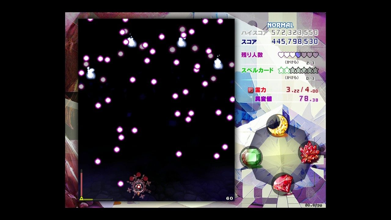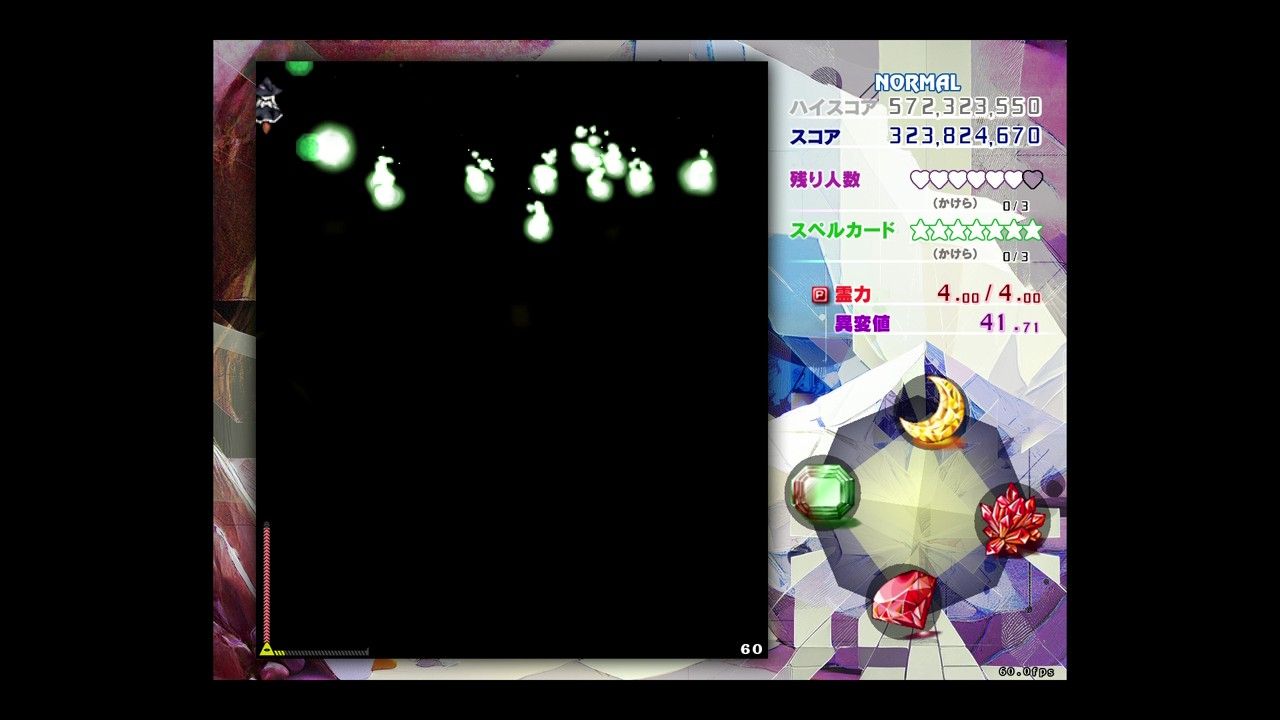 弾幕の軌道に沿って移動しつつ、間隔が空いたら抜けましょう。異変攻撃がたまったら、低速で上の弾幕密集地帯に突っ込み、高速で下がることで異変石のかけらを稼ぎます。